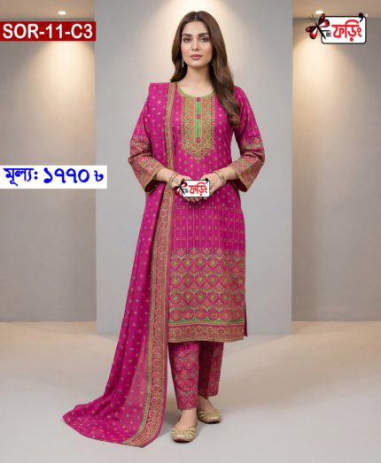 এমব্রয়ডারি ডিজাইন এবং স্ক্রিন প্রিন্টের কাজ করা কটন থ্রি-পিস – Foring Collection