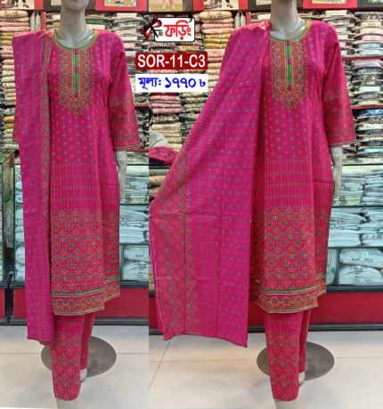 এমব্রয়ডারি ও স্ক্রিন প্রিন্টের কাজ করা কটন থ্রি-পিস – Foring Collection