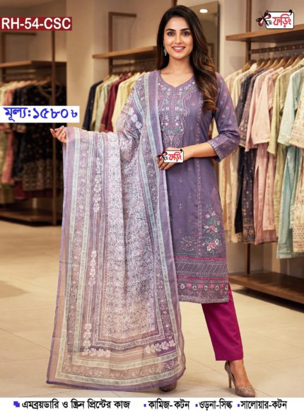 এমব্রয়ডারি ও স্ক্রিন প্রিন্টের কাজ করা কটন থ্রি-পিস – Foring Collection