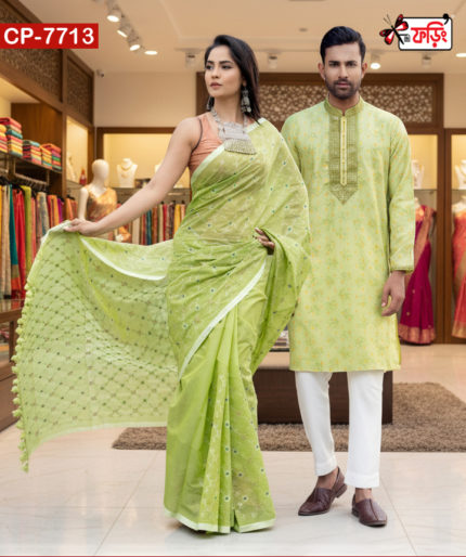 Luxury Women’s Half Silk Saree And Imported Fabric Embroidered Cotton Panjabi for Couples