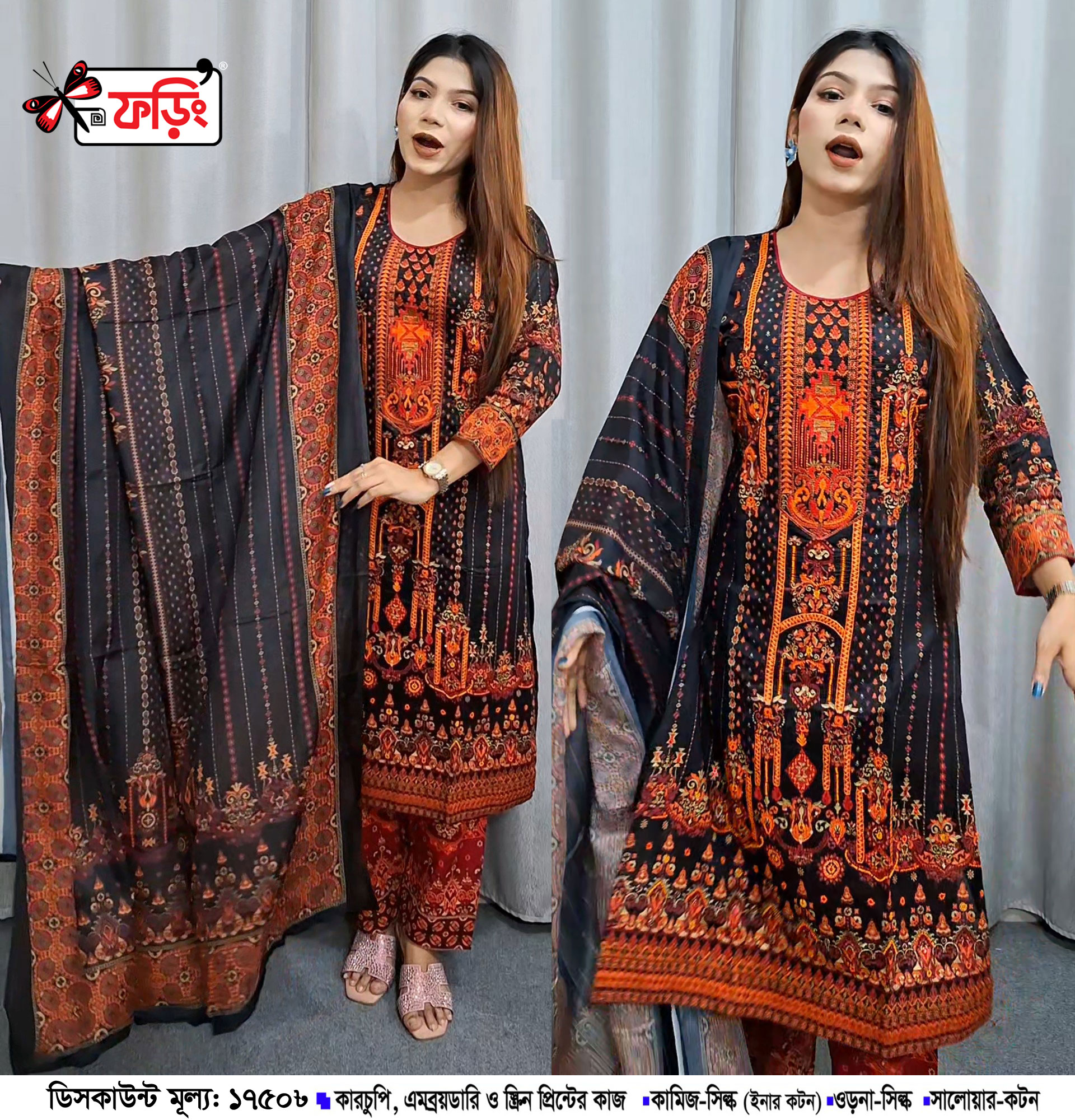 💃 কারচুপি, এমব্রয়ডারি ও স্ক্রিন প্রিন্টের কাজ করা সিল্ক থ্রি-পিছ ।