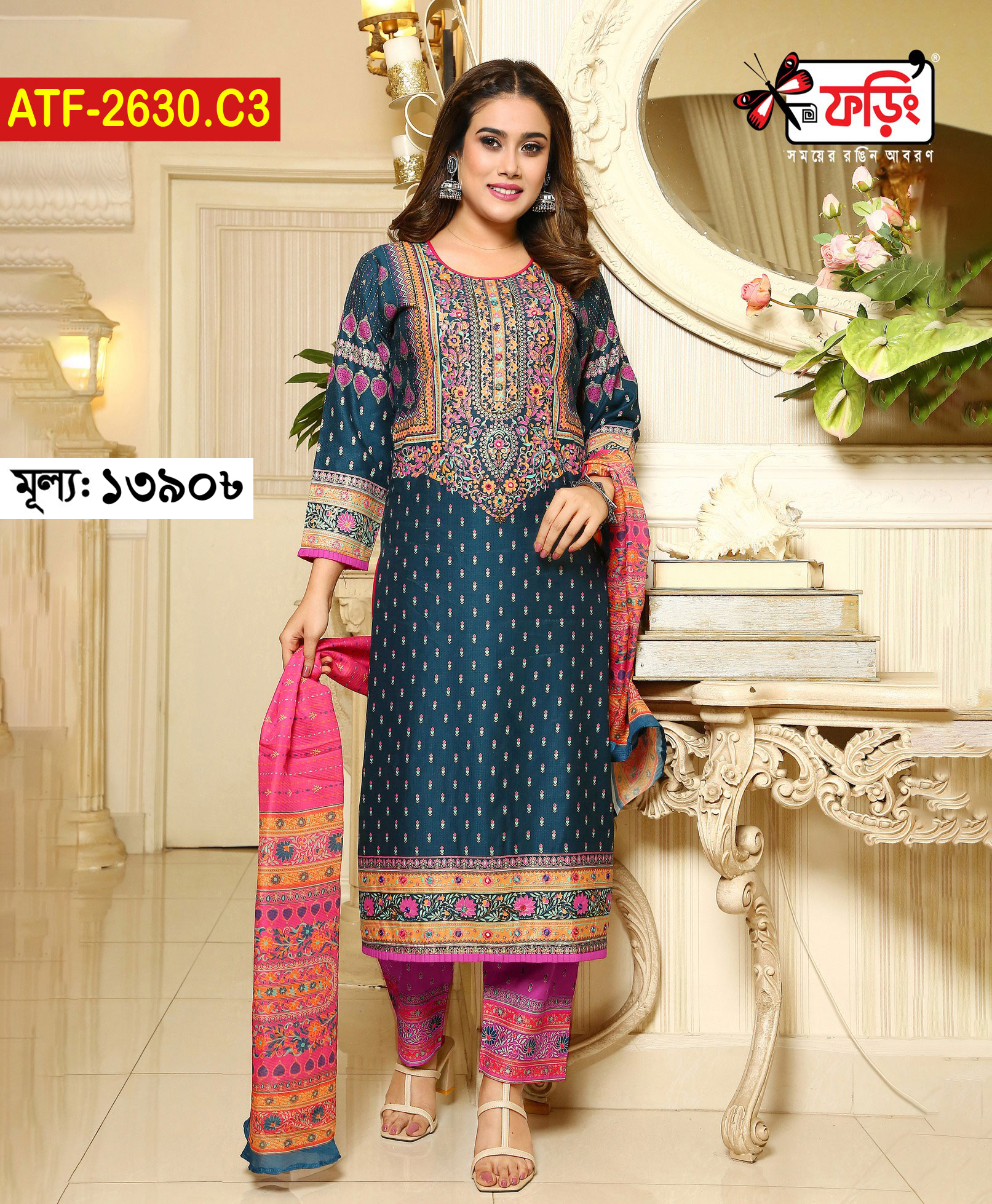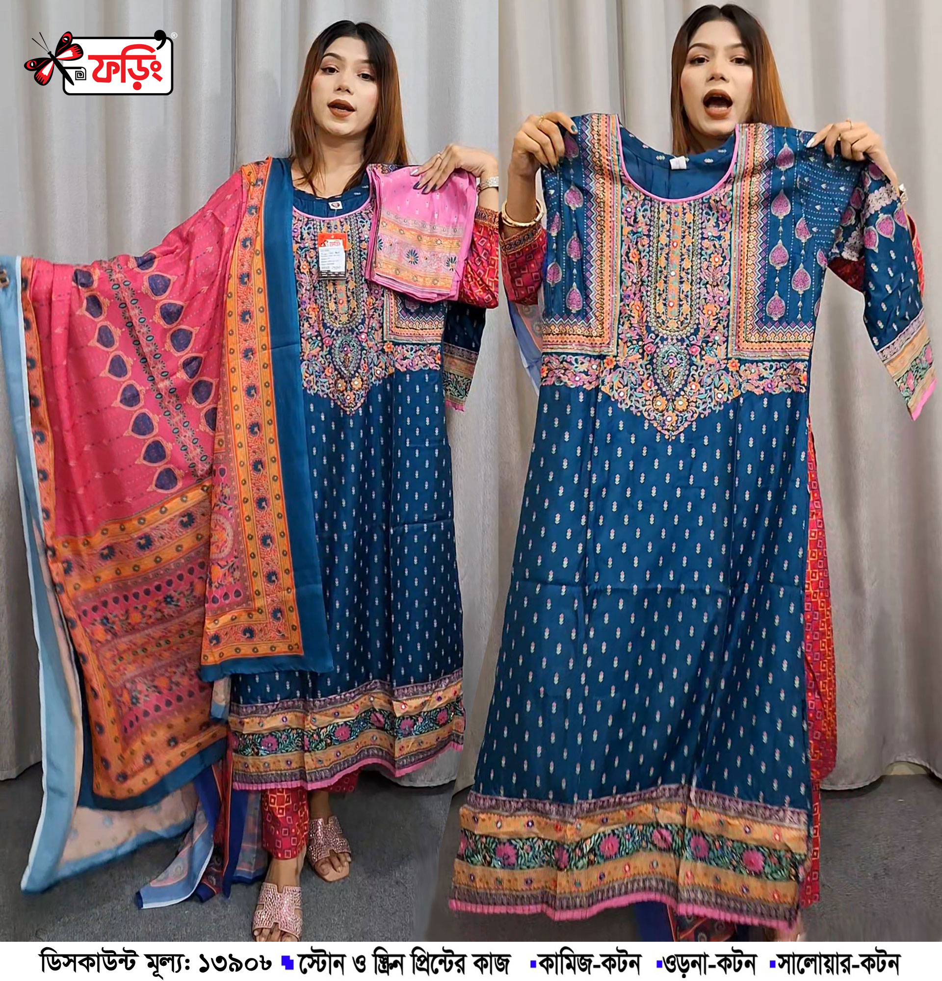 কটন থ্রি-পিছটি পাচ্ছেন এমব্রয়ডারি ও ব্লক প্রিন্টের কাজ করা