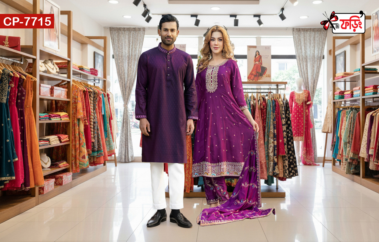Luxury Women Imported Fabric Embroidered Silk Shalwar kameez Set And Stylish Men Embroidered Imported Cotton Panjabi for Couples