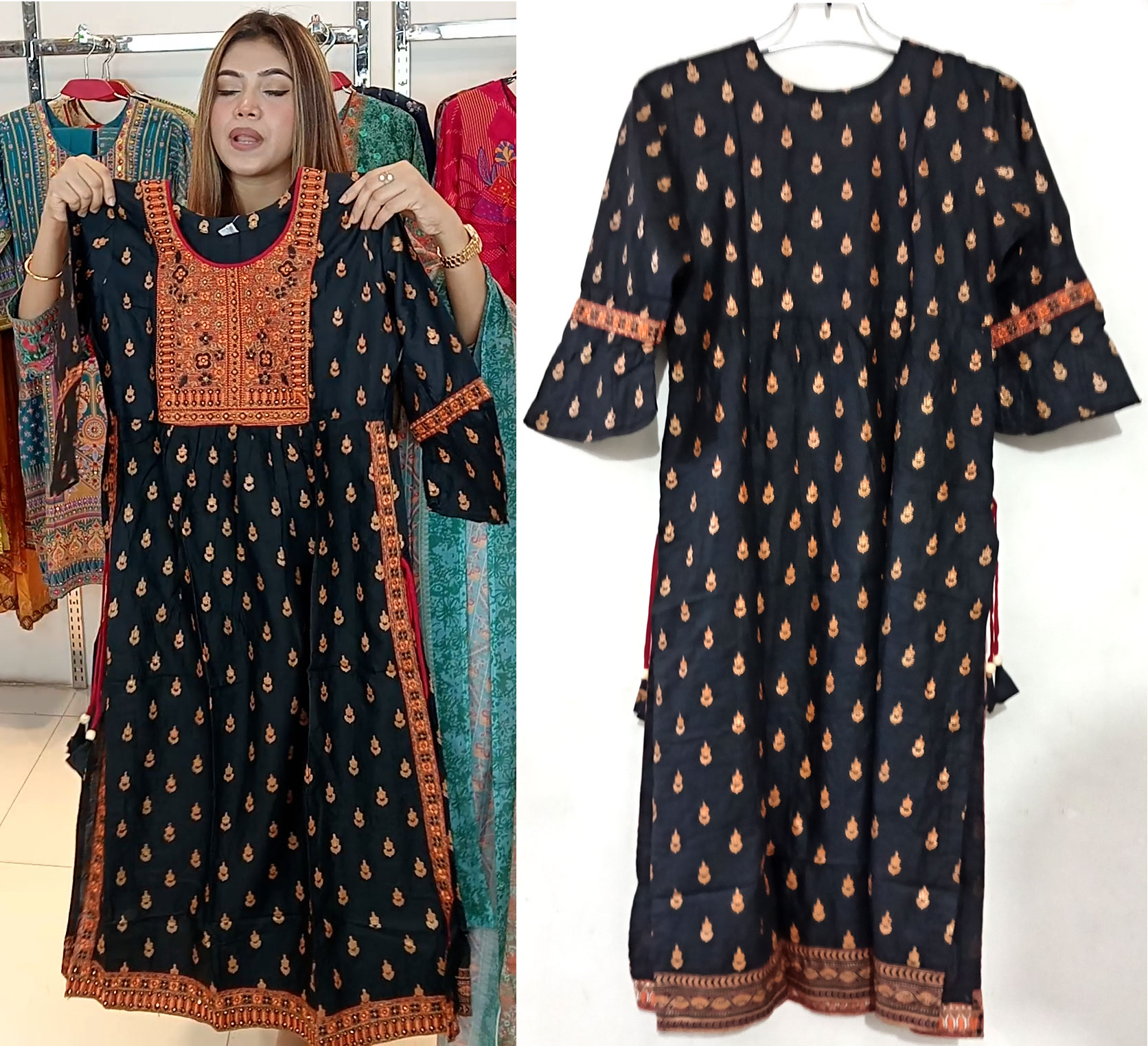 স্ক্রিন প্রিন্ট ও এমব্রয়ডারি এবং সিকোয়েন্স কাজের নায়রা স্টাইল কটন ওয়ান পিস