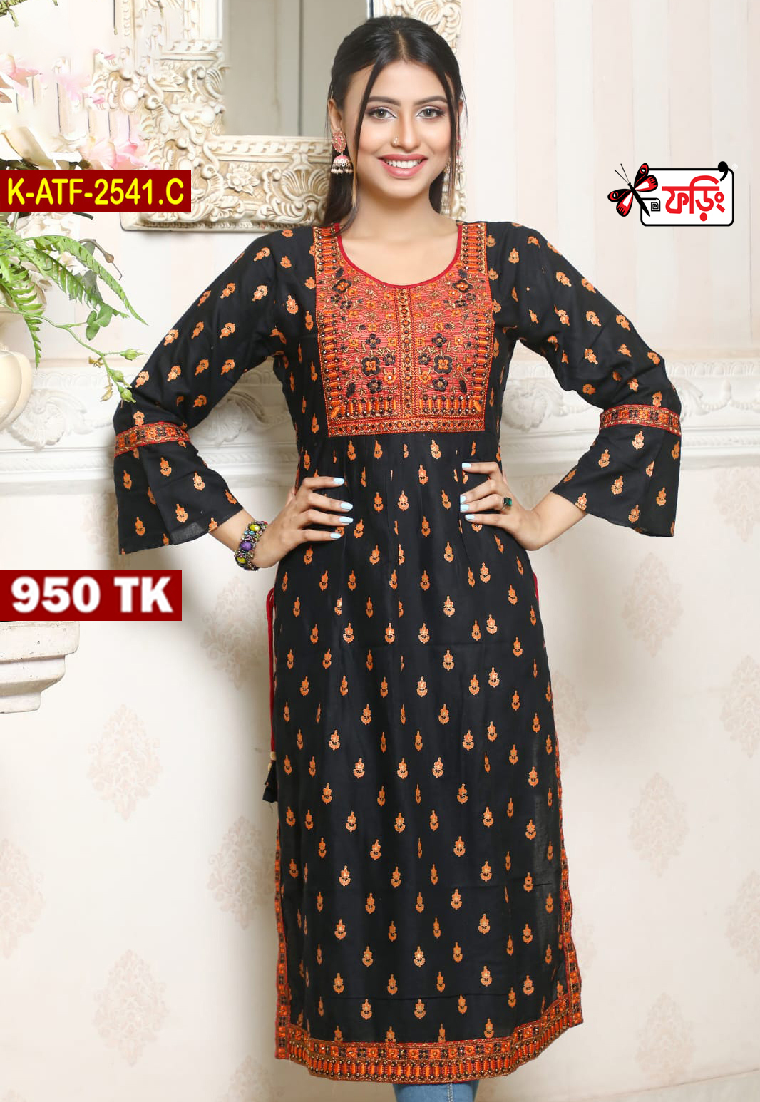 কামিজ স্টাইল কটন ওয়ান পিসটি পাচ্ছেন এমব্রয়ডারি ও স্ক্রিন প্রিন্টের কাজ করা
