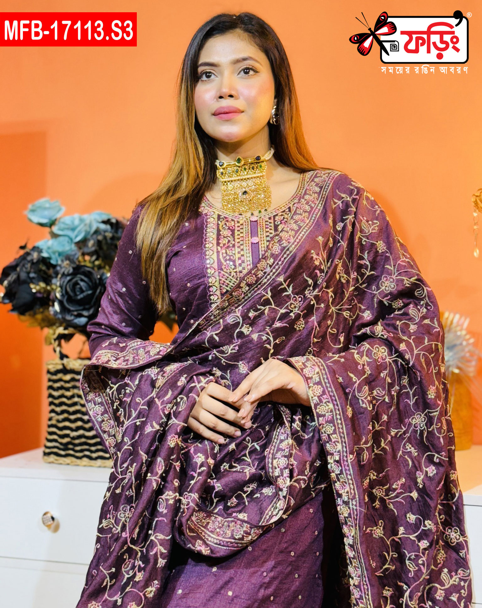 Artistic Embroidered Design Luxury Women’s Imported Silk Fabric Stitched Shalwar Kameez Set