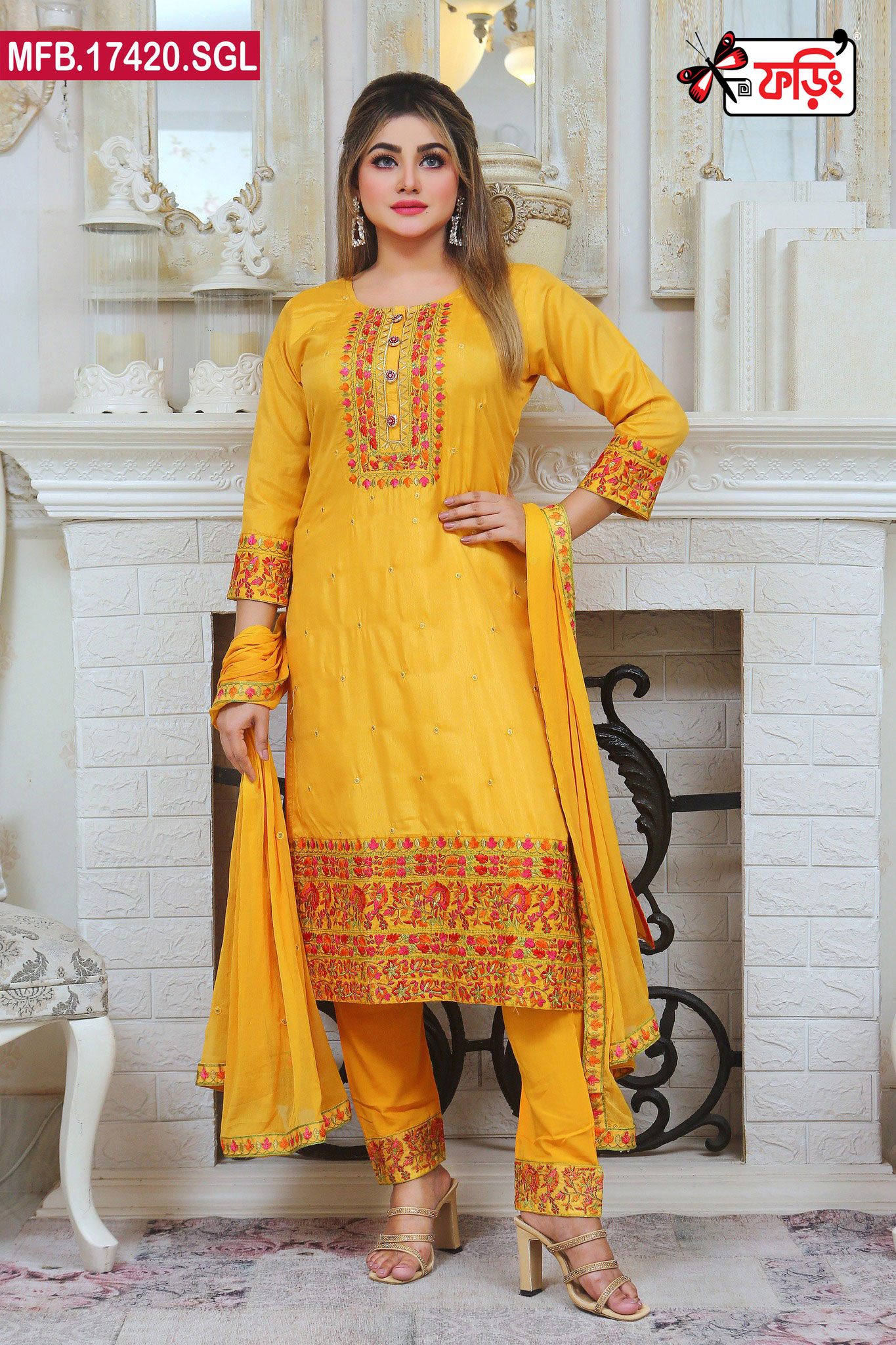 Luxury Women’s Imported Silk Fabric with Embroidered Stitched Shalwar Kameez Set