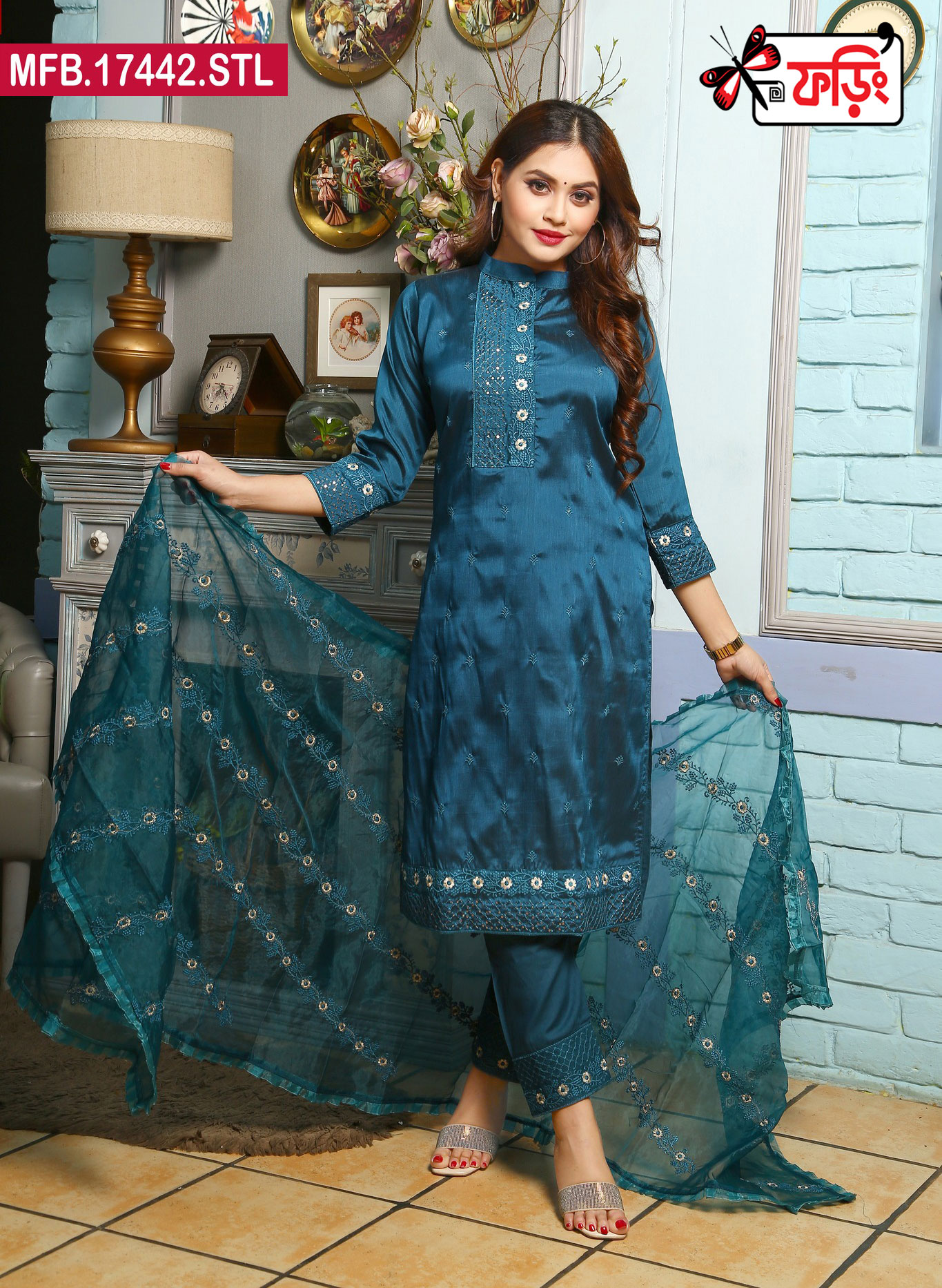 Premium Style Ladies Silk Two Piece Outfit with Embroidered Design