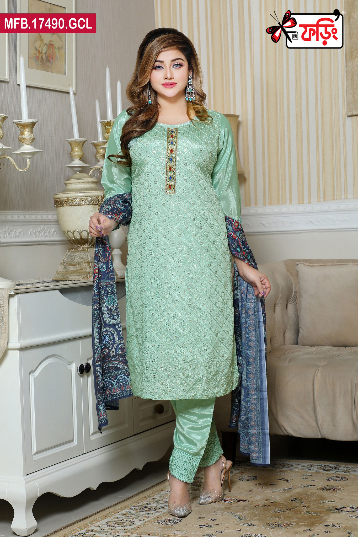 Premium Style Ladies Silk Two Piece Outfit with Embroidered Design