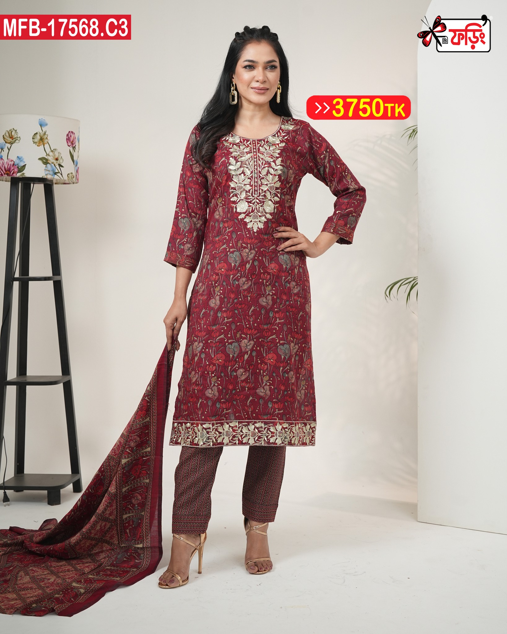 💃এমব্রয়ডারি কাজ করা কটন রেডি থ্রি-পিছ