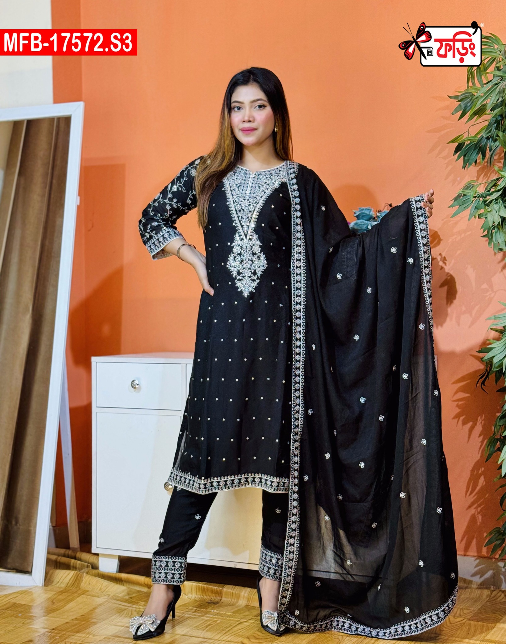 Artistic Embroidered Design Luxury Women’s Imported Silk Fabric Stitched Shalwar Kameez Set