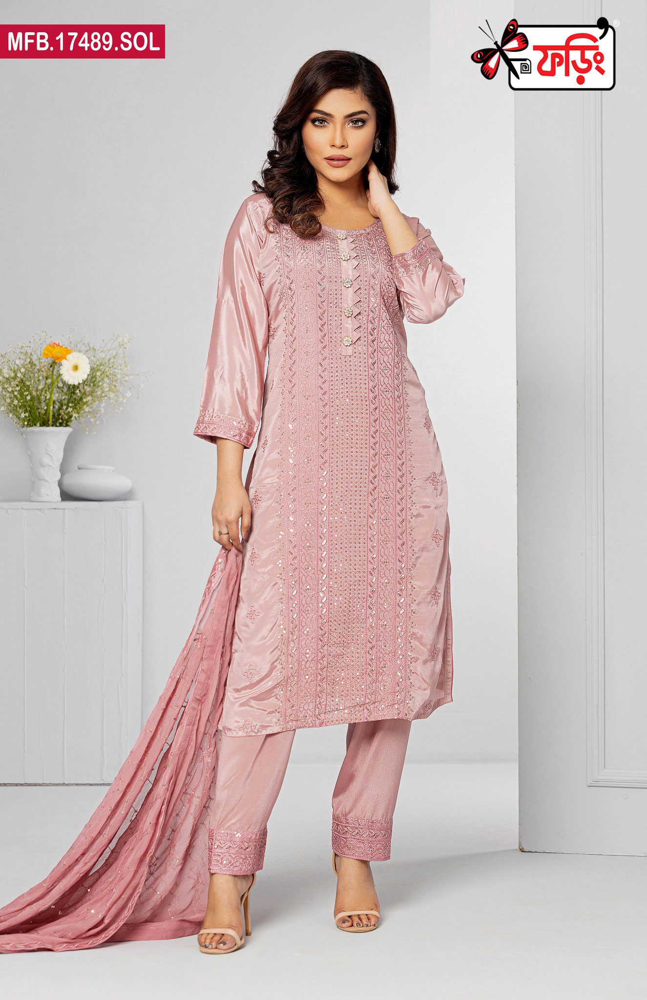 Premium Style Ladies Silk Two Piece Outfit with Embroidered Design
