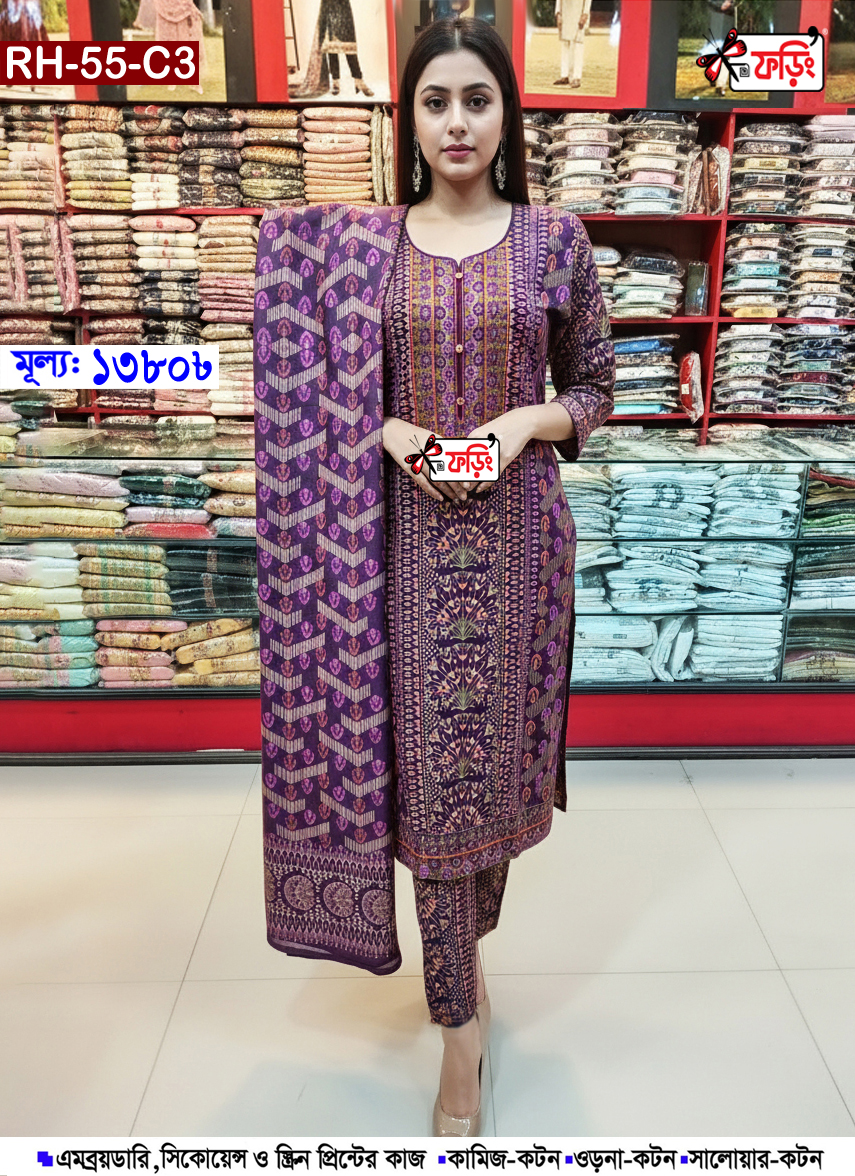 এমব্রয়ডারি ও স্ক্রিন প্রিন্টের কাজ করা কটন থ্রি-পিস – Foring Collection