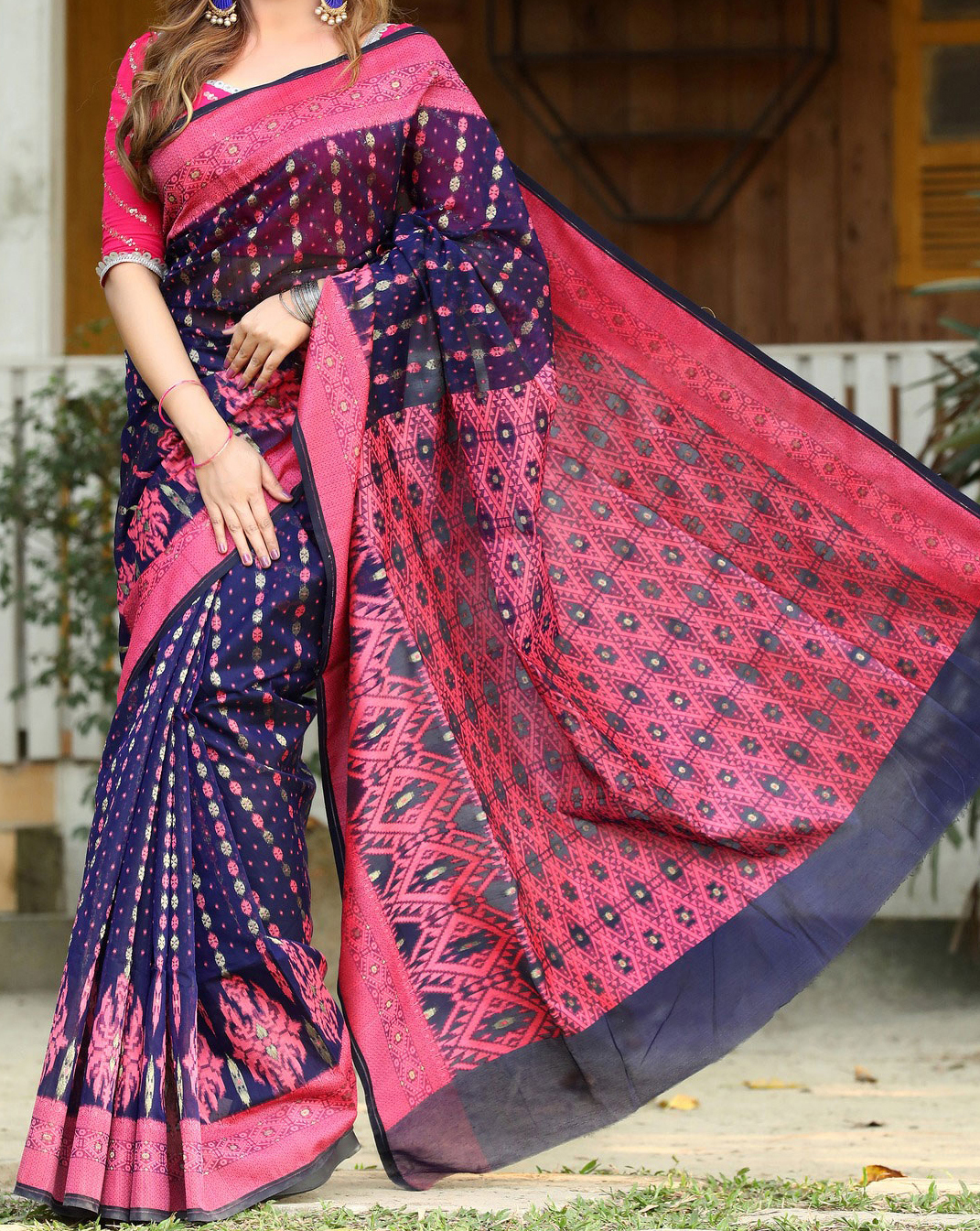 Blue Color Designer Silk Jamdani Sharee. Aesthetic Stylish and elegant piece from – Foring Collection. Include Running Blouse Piece Available