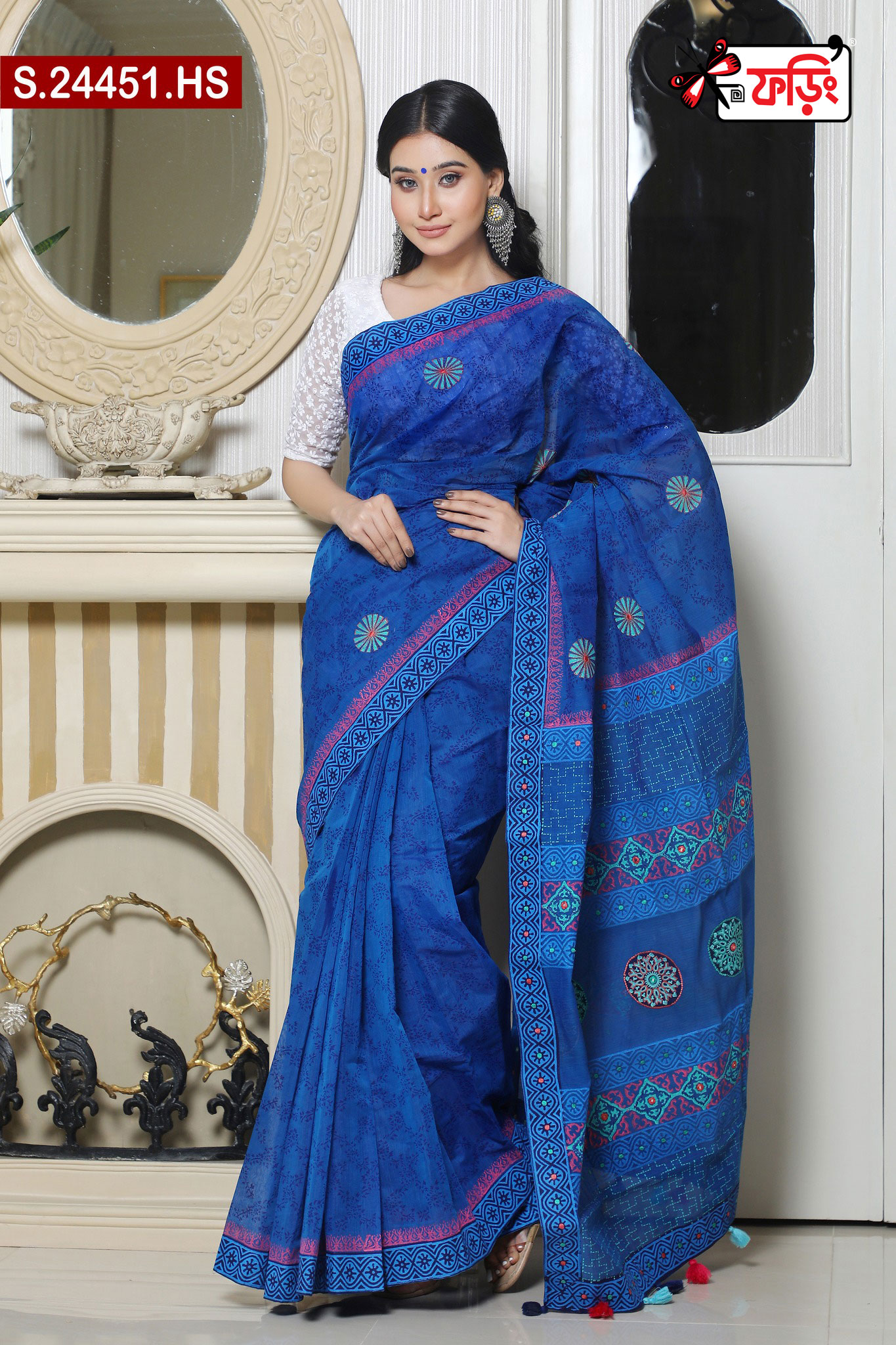 ✅ Blue Color Premium Half Silk Boutique Sharee | Embroidered & Screen Printed – Foring Collection. Include Running Blouse Piece Available