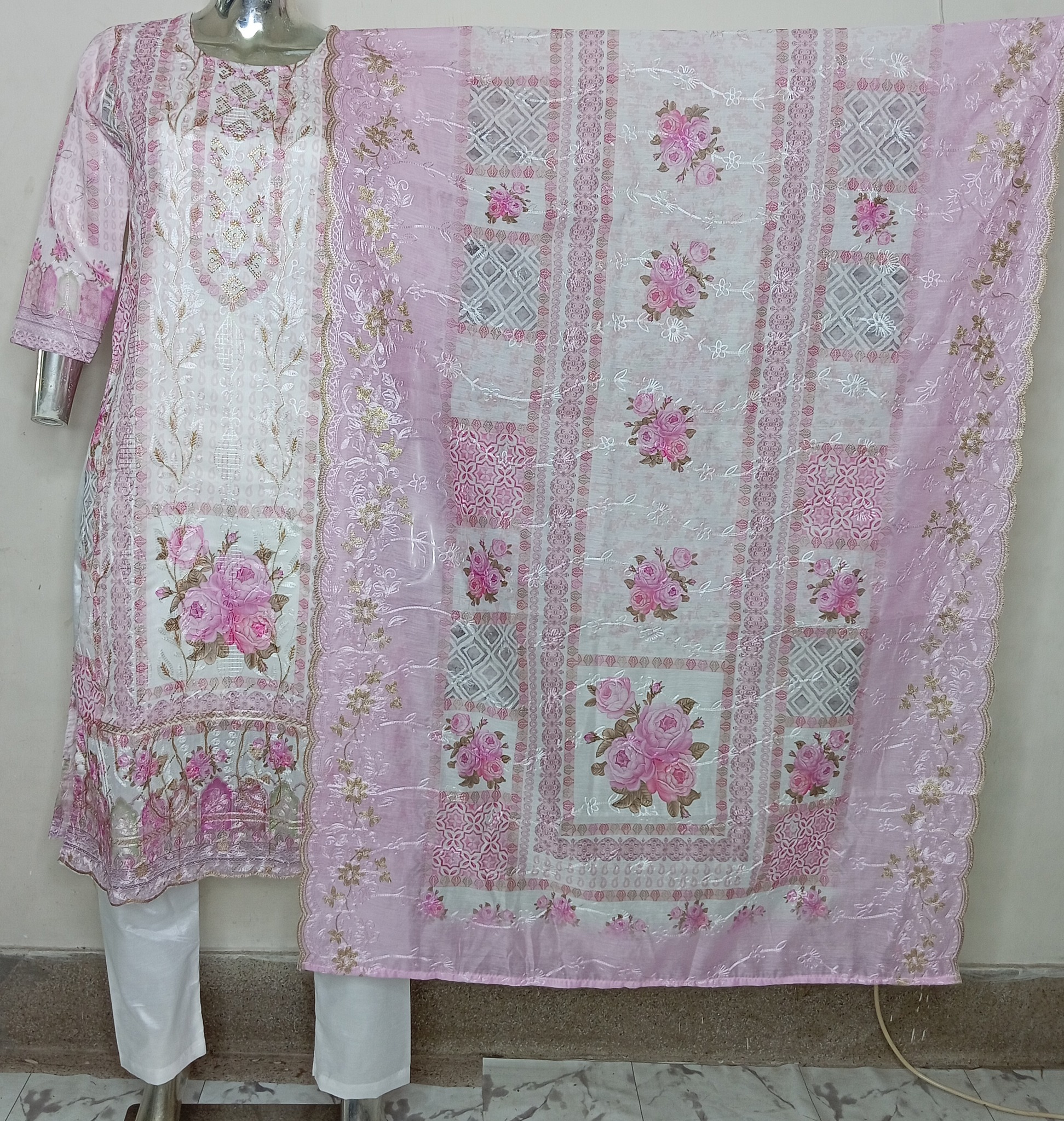 স্ক্রিন প্রিন্টের উপর স্টোন ওর্য়াক ও গুজরাটি আরি কাজ করা আনস্ট্রিজ থ্রি পিস ইমপোর্টেড সিল্ক ফেব্রিক্স